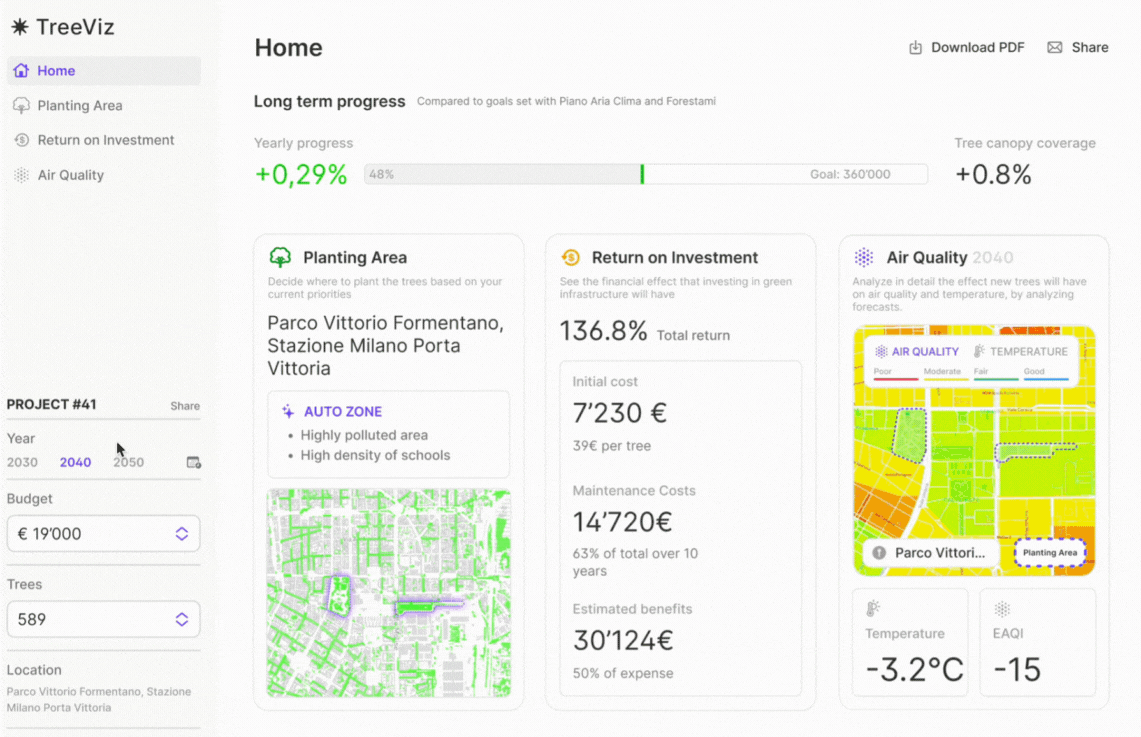The dashboard includes a map interface that identifies suitable areas for tree planting in Milan. The dashboard utilizes an AI system that employs image segmentation techniques to identify suitable tree planting locations in the Metropolitan City of Milan. The system is trained using a dataset consisting of satellite images covering the entire city, along with hand-labeled potential tree planting areas. The model architecture, is employed to learn the spatial characteristics and patterns associated with these locations. The trained model is capable of processing new satellite images and generating pixel-level segmentation masks that highlight potential tree planting areas.