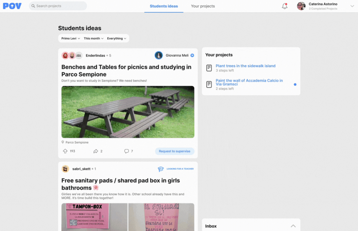 POV wants to encourage citizen participation in students. It targets middle school students so that they can learn to have their say, to propose and to plan projects. POV adapts a similar aesthetic and interaction to ones the target group is used to such as Instagram and TikTok, to catch their attention and meet their needs, but focused on idea generation and sharing in terms of civic engagement as well as upvoting on these ideas fast.